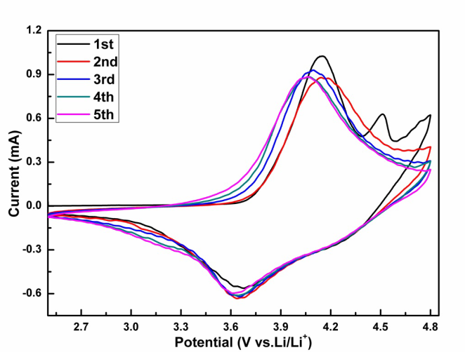 4.5V氧化峰强度和3.6V以下的还原峰的强度应该同强同弱,所以这个图形还是比较是合理的。
