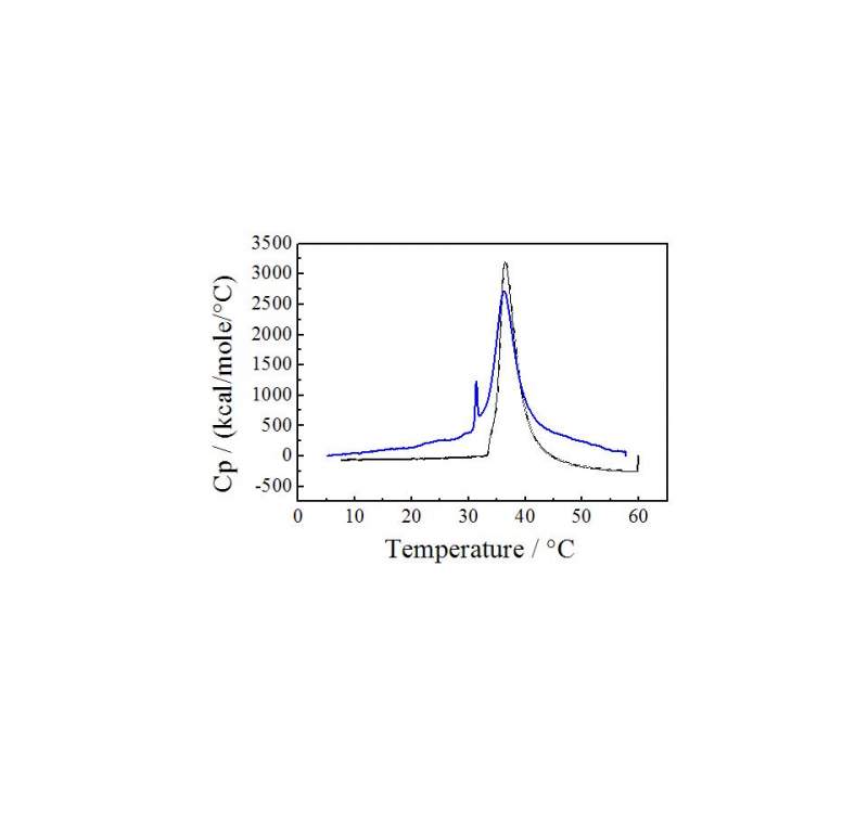 一端接有染料的PNIPAM,NanoDSC数据如下,cooling过程左侧有个尖峰,请高人分析一下形成的原因,谢谢