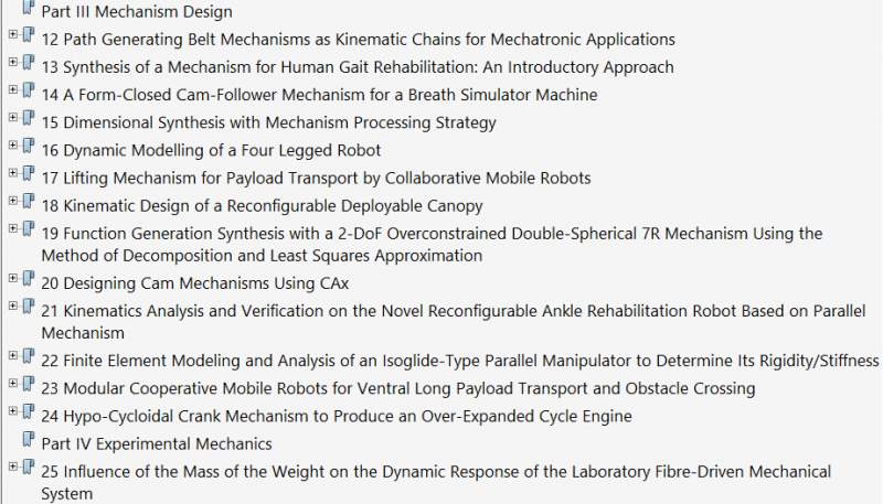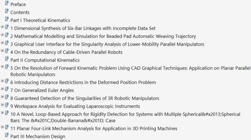 书名:Mechanisms and Machine Science 作者:Paulo Flores and Fernando Viadero 总页数:915 出版社:Springer 目录:(太长啦,截取一部分) 封面截图: 内容截图: |