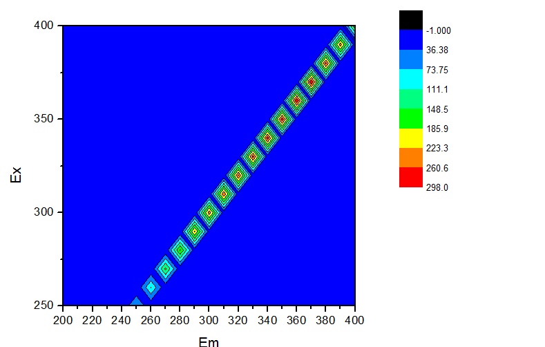 我想请教大家使用三维荧光测试水样,怎么出来的图是这样的?怎么消除这种现象,我的水里面含有HA BSA 高岭土等