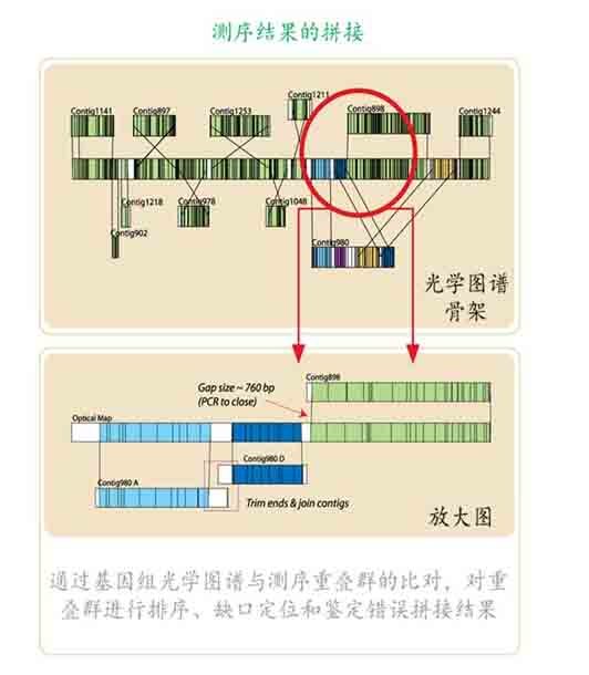 作为对基因组454-Sanger 杂交测序法的一种新的替代技术,光学图谱技术提供了一种全新的微生物基因组测序和拼接策略,虽然该技术不能直接获得基因组DNA 的碱基序列,但它可以提供微生物基因组整体有序的物理框架结构。通过与新一代测序技术的结合,光学图谱技术可以提供基因组绝大多数Contig 的位置和顺序信息,从而辅助基因组的Scaffold 构建,在复杂微生物基因组(多重复序列)的Gap closure 中已经被证明行之有效。