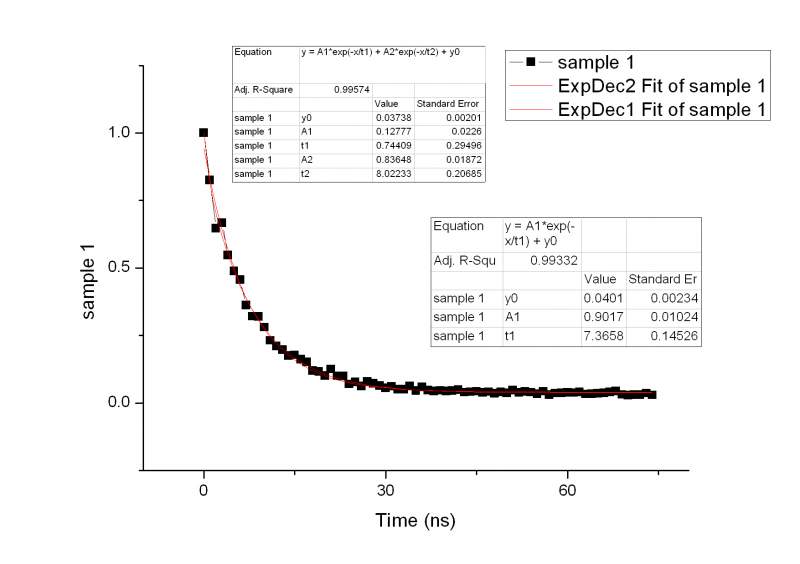 各位做过荧光寿命试验的虫友看过来,如附件中的图该怎么分析?为什么用不同的拟合,得到的结果不一样?从图中结果能否看出荧光寿命?在ExpDec2中荧光寿命如何算? 请各位不吝赐教。 fluorescence life.jpg |