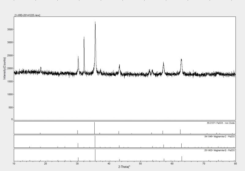通过XRD图大概能够判断样品中的物质是四氧化三铁或γ-三氧二化铁。 但是这张XRD图的第二强峰的位置,跟四氧化三铁或γ-三氧化二铁标准图的位置不对应。想知道第二强峰可能是什么物质,不知道怎么找出来,求教高手帮忙~ 可能有的元素:Fe,O,C,N,Cl 样品1.jpg |