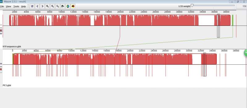 我将两株噬菌体PE3和K1F进行了基因组比对,得到如下结果,请问该如何分析该图? 我查过相关文献,对于细菌的基因组对比中有较多的模块基因,但是我的噬菌体基因怎么几乎是完整的条状? mauve截图.jpg |