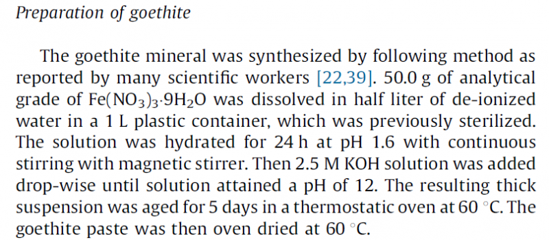 针铁矿合成,方法很多,这个步骤有些复杂,记得之前合成过针铁矿,相对简单,建议楼主参考如下的一本书,里面有各种类型铁矿合成的方法,可以看看:http://muchong.com/bbs/viewthread.php?tid=7634962 |