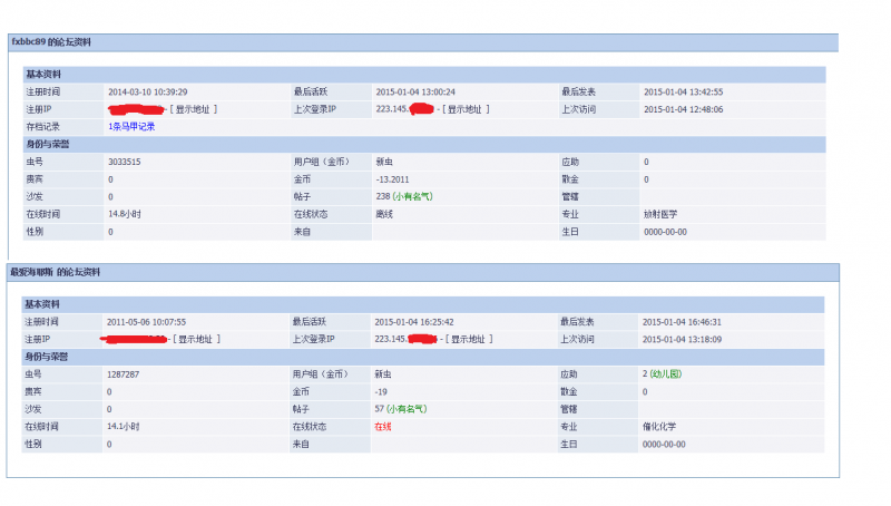 鉴于ID fxbbc89、最爱海耶斯 以相同 IP 223.145.***.***,求助应助,涉嫌马甲转移金币(根据 https://muchong.com/bbs/viewthread.php?tid=203364)。 【马甲帖链接】 https://muchong.com/bbs/viewthread.php?tid=8374800&pid=10#pid10 【马甲ID解释】 第一次 点错了,带有悔意 第二次再犯 根据版规,认定 ID fxbbc89、最爱海耶斯 涉嫌ip相同,转移金币,为典型的马甲行为! 本版对于马甲求助行为一律严惩,根据【马甲行为】定义及处理规范(2011版)规定,经过本版版主讨论决定:对 ID fxbbc89、最爱海耶斯 第一次 各处以15BB处罚,第二次再犯各处以100BB重罚 望其他求助者以此为鉴,切莫以身试法,共同营造一个健康,良好的求应助乐土。 马甲行为.png [ Last edited by liwentao2010 on 2015-1-12 at 20:27 ] |