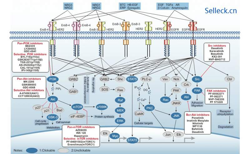 一、 EGFR简介 EGFR是原癌基因c-erbB1的表达产物,是表皮生长因子受体(HER)家族成员之一。该家族包括HER1(erbB1,EGFR)、HER2(erbB2,NEU)、HER3(erbB3)及HER4(erbB4)。HER家族在细胞生理过程中发挥重要的调节作用。 EGFR广泛分布于哺乳动物上皮细胞、成纤维细胞、胶质细胞、角质细胞等细胞表面,EGFR信号通路对细胞的生长、增殖和分化等生理过程发挥重要的作用。EGFR等蛋白酪氨酸激酶功能缺失或其相关信号通路中关键因子的活性或细胞定位异常,均会引起肿瘤、糖尿病、免疫缺陷及心血管疾病的发生。 二、 信号通路图 三、 Afatinib生物活性 产品描述: Afatinib(BIBW2992)是一种不可逆EGFR/HER2抑制剂,对EGFR(wt), EGFR(L858R), EGFR(L858R/T790M)和HER2均有抑制作用,IC50分别为0.5 nM,0.4 nM,10 nM和14 nM;用于Gefitinib抗性的突变型EGFR (L858R-T790M )时,活性增强100倍。 体外研究: Afatinib不可逆地抑制EGFR/HER2,在体外作用于野生型EGFR ,L858R突变型EGFR, L858R/T790M 双突变型EGFR,及HER2时IC50分别为0.5, 0.4, 10, 14 nM。在体外实验中,BIBW2992不管作用于野生型EGFR/HER2还是突变型EGFR/HER2都显示出强大的活力,与gefitinib作用于L858R突变型EGFR的活力差不多,但是要比gefitinib 作用于L858R-T790M双突变型EGFR的活力大100倍。 体内研究: 活体研究时按实验对象体重,每千克口服20 mg BIBW2992持续25天,肿瘤产生明显的衰退现象,通过肿瘤切片的免疫组织化学染色观察发现,EGFR和AKT的磷酸化作用收到抑制。 原文:http://bbs.bioguider.com/thread-29110-1-1.html |