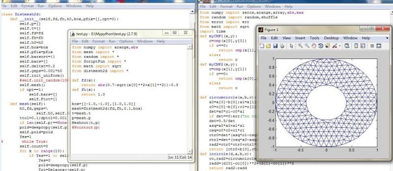 2维的凸包Delauany三角剖分程序:Delaunay和基于力平衡网格光滑化程序:Distmesh2d,OOP方式编写,雏形完成了,给自己庆祝下吧![]() 调试了整整两天,各种问题 这里的论文http://persson.berkeley.edu/distmesh/中的代码,和提供的matlab源程序有几处不一样,按论文里进行点的边界拉回,程序失败,因为没注意到这个,一天的时间耗在了这里,逐句对比内部数据的数量级进行排查,来找错,相当耗精力, 正如所见,边界处的毛刺问题没有解决,还有很多优化的地方,如果在秒级的时间内剖分1000左右点的图形,就差不多了。准备花一个礼拜时间慢慢调整 网格预处理结束,就可以好好欣赏有限元理论了 发几张图,留念下 边界点的受力扩张移动.jpg 程序一角.jpg 椭圆剖分.jpg |