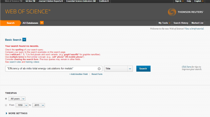 今天用web of science搜这篇文献http://www.sciencedirect.com/science/article/pii/0927025696000080 Kresse G, Furthmuller J, Efficiency of ab-initio total energy calculations for metals and semiconductors using a plane-wave basis set. Computat. Mat. Sci. 1996(6):15-50 怎么搜都搜不到,试过题目,作者,doi,全都提示找不到。之后我又让一位师兄和一位老师找,都搜不到。 刚才我让以为外校的同学搜一下看看,结果一搜就中,怎么搜怎么中。我们发截图对比过,一样的设置,一样的搜索范围,人家就能搜到,我却搜不到,难道说这个还跟学校有关?求大神指导 11111.png |