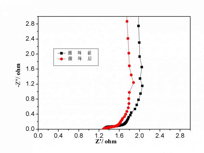 刚接触电化学,对电化学阻抗很是迷惑。做的是碳超级电容器,其中黑色曲线是循环前的曲线,而红色是循环后曲线。但分析时总感觉不对劲。循环后电容下降,圆弧半径应该变大才对啊。为什么我做的曲线不是这样的呢?怀疑是实验有问题,于是又做了重复试验,仍然如此。不知道我是哪里出了问题?还是有可能有这样的情况发生,又怎么去分析呢?并且我发现循环后较之循环前,低频区的直线变短了,这又是为什么?问题很多,求大神指点,不甚感谢!