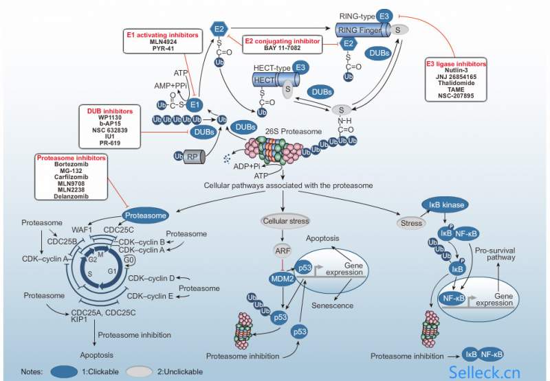 Carfilzomib(PR-171)是一种不可逆proteasome抑制剂,IC50为<5 nM,在体外优先抑制β5亚基的ChT-L活性,对PGPH和T-L活性很弱或没有作用。 体外研究:Carfilzomib抑制多种细胞系和源自患者的肿瘤细胞的增殖,包括多发性骨髓瘤。Carfilzomib诱导内在和外在的凋亡信号传导途径并激活c-Jun N-末端激酶(JNK)。与bortezomib相比,Carfilzomib协同地塞米松(Dex)表现增强的抗MM活性,并克服了bortezomib等药物的抗性。 Carfilzomib有选择地抑制β5亚基的CHT- L活性,在10 nM剂量时抑制超过80%的活性。低剂量Carfilzomib短期处理导致优先结合特异性的β5组成20S蛋白酶体和β5i免疫蛋白酶体亚基。在Carfilzomib刺激的ANBL -6细胞中检测caspase活性,结果显示caspase- 8和caspase -9和caspase-3活性在8小时后大幅增加,和对照8小时后的细胞相比分别增加了3.2 , 3.9和6.9倍。在carfilzomib处理过的细胞中,线粒体膜的完整性减少到41%(Q1 + Q2),而在对照细胞中这一比例为75%。在另一项研究中,Carfilzomib也表现出对血液和实体肿瘤的临床前有效性。 Carfilzomib直接一直破骨形成和骨吸收。 体内研究:Carfilzomib适度降低了体内异种移植物模型中肿瘤的生长。在持续或短暂处理下, Carfilzomib有效地降低多发性骨髓瘤细胞活力。 Carfilzomib增加骨小梁体积,减少骨吸收,并提高非肿瘤小鼠的骨形成。 信号通路图: |