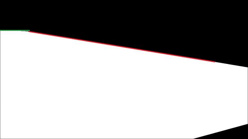 该图像是对一张原始图像进行处理后的结果,对于图像上半部分黑白相交处的边缘,我想用直线拟合,如第二个图片那样,得到两个直线。这两条线的四个端点我需要用到。