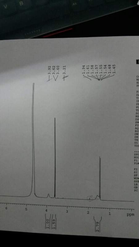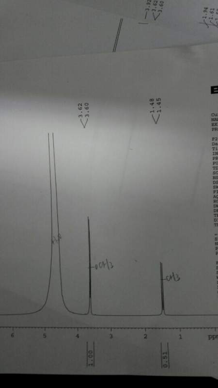 甲基膦酸二甲酯(OCH3)P=O(CH3)2在D2O中的氢核磁大概可以分析出来,1.5ppm为-CH3,3.6ppm为-OCH3,但是他的水解产物在D2O中的质谱图不会分析,可能含有甲醇,甲基膦酸(CH3)3P=O,不确定是不是含有所以用了核磁分析 水解后.jpg 甲基膦酸二甲酯.jpg |