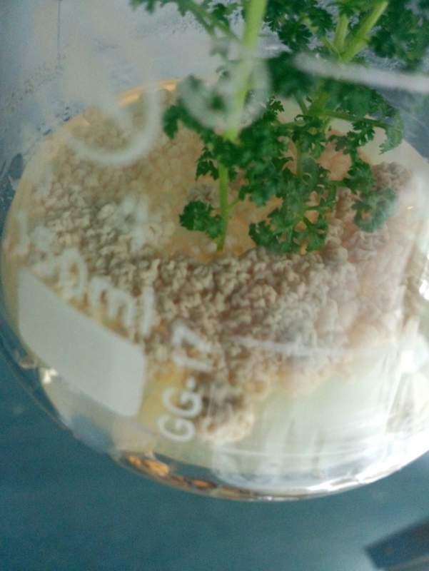 在加了蔗糖的MS植物培养基上发现一些奇怪的菌落,生长很缓慢,白色卷曲的样子,