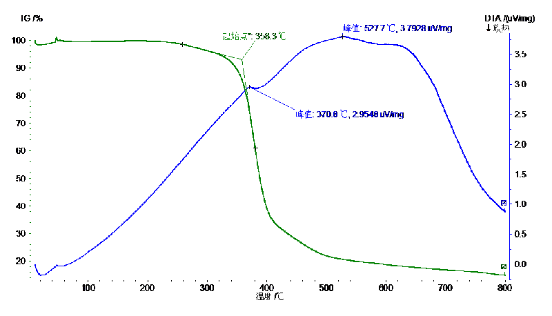 这是TGA/DSC连用曲线,左边的轴时失重,% 右边是DSC曲线,uV/mg不过我看DSC一般是W/g可能一样的吧。能看出材料在350左右分解,这个图做的不是很好,