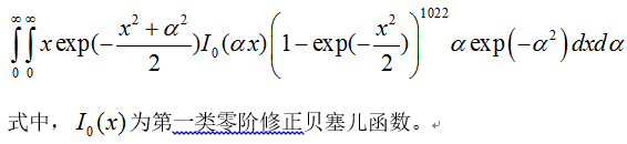 我用maple 7 > f:=BesselI(0, alpha*x)*alpha*exp(-alpha^2)*x*exp(-(x^2+alpha^2)/2) > *(1-exp(-x^2/2))^1022; > s:=int(int(f,alpha=0..infinity),x=0..infinity); s := 3299122687584745137204367643230771106304997323142764671919892526213274482351735424595090152580805831487201081992151782359365957048266356808329891738576418898384550273099110184494910603827424479869838674181059409833013059735407792907696592569535276701736861158593056561375652527873922258647738643928389281331366095207532193114305843094745273866336452296051523189325911545359997748735545153365459326965824504140992990653748551563388621812295143879168563643028714331800616525107242938555105725864904443179487735448344512225826058337229629080065151365167343274055473303802181974301995992231288914893936583978868212030806302235382565661039319775858591452481276532369619717771944703319704609243884667963269698910969623461539798686254883/741993016396956735405613435356683782697512283069823991064277931426980443824577566664069913413257621498538182516652902989918523185791709453919677031772399696514284422802749913157553979575003207665736459377430450383919221006176370669384465219743309411041792052666184021088982010598590366702909953828519058138526150106114448075948267632468571674052634702160284009616244631715592753300091481834250539282210722819840060174111768646004068650228726292470427652007163617929736425185577083563672618801965072487519722221379722725217400914053294087849015460578362361120445241591716408147719927671948668690922637069198489929597905348227031903643587457869031130741184797205245991710558088926873306205286102419574747370548119522443416892882892800 数值 > evalf[15](s); .00444629883931381 不知道是否是你期待的 |
