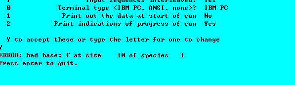 用phylip的最大似然法做系统发育树,运行dnaml.exe后,就出现下面的东东,我把species1 的序列去掉后,还是出现类似的情况,哪里出错了呢,求大神指点