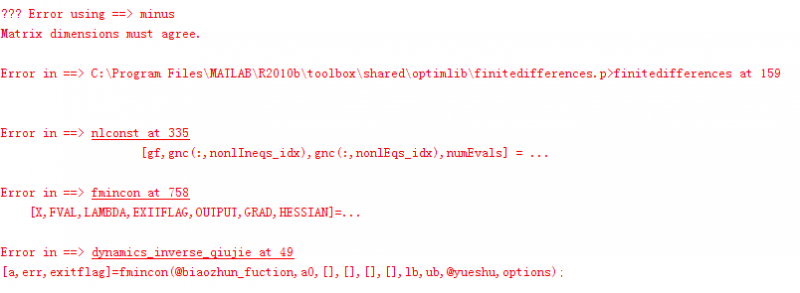 程序在附件中,其中dynamics_inverse_qiujie.m为优化主程序,biaozhun_function.m为优化目标函数,yueshu.m为约束函数。 程序里面的初值a0已经满足我的需要了(是手调得到的),但仍然存在一个错误。如图片所示 yueshu.m中计算出来的g的个数本来是10个,最后一次计算变成了11个,如下图所示。 还请高手解答 因为不能在原贴上编辑,所以又重新发了这个求助帖,原帖在。如果能解决问题,金币可以都奉送哈 http://muchong.com/bbs/viewthread.php?tid=8413221&page=2 1.png 2.png |