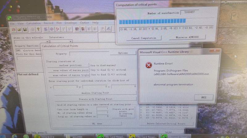 最近算的农药分子与铝氧层吸附体系的AIM,在calculation critical points中的第三步try to find(3,+1)critical计算未达到一半的时候出现一个提示对话框,提示D:AIM2000.exe abnormal,点击确定后,程序就自动关闭了。请问出现这种情况是什么原因?师哥师姐做的水分子与铝氧层吸附的AIM计算没有出现过这种情况,是因为农药分子太大了吗?有没有什么方法可以解决呢?