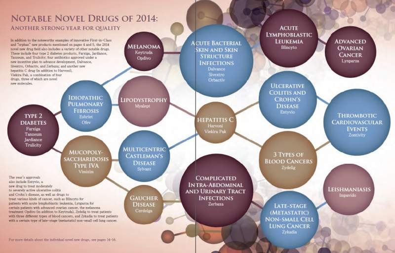 http://www.fda.gov/Drugs/Develop ... ovation/default.htm New Drugs at FDA: CDER’s New Molecular Entities and New Therapeutic Biological Products 2014 Novel New Drugs Summary 2014 Novel New Drugs Summary (PDF - 13MB) Innovation drives progress. When it comes to innovation in the development of new drugs and therapeutic biological products, FDA’s Center for Drug Evaluation and Research (CDER) supports the pharmaceutical industry at every step of the process. With its understanding of the science used to create new products, testing and manufacturing procedures, and the diseases and conditions that new products are designed to treat, FDA provides scientific and regulatory advice needed to bring new therapies to market. The availability of new drugs and biological products often means new treatment options for patients and advances in health care for the American public. For this reason, CDER supports innovation and plays a key role in helping to advance new drug development. Each year, CDER approves a wide range of new drugs and biological products. Some of these products are innovative new products that never before have been used in clinical practice. Others are the same as, or related to, previously approved products, and they will compete with those products in the marketplace. Certain drugs are classified as new molecular entities (“NMEs”) for purposes of FDA review. Many of these products contain active moieties that have not been approved by FDA previously, either as a single ingredient drug or as part of a combination product; these products frequently provide important new therapies for patients. Some drugs are characterized as NMEs for administrative purposes, but nonetheless contain active moieties that are closely related to active moieties in products that have previously been approved by FDA. For example, CDER classifies biological products submitted in an application under section 351(a) of the Public Health Service Act as NMEs for purposes of FDA review, regardless of whether the Agency previously has approved a related active moiety in a different product. FDA’s classification of a drug as an “NME” for review purposes is distinct from FDA’s determination of whether a drug product is a “new chemical entity” or “NCE” within the meaning of the Federal Food, Drug, and Cosmetic Act. Graph symbol View animated charts from the 2014 Novel New Drugs Summary publication on the right. (Not viewable in Internet Explorer version 7 and below.) |