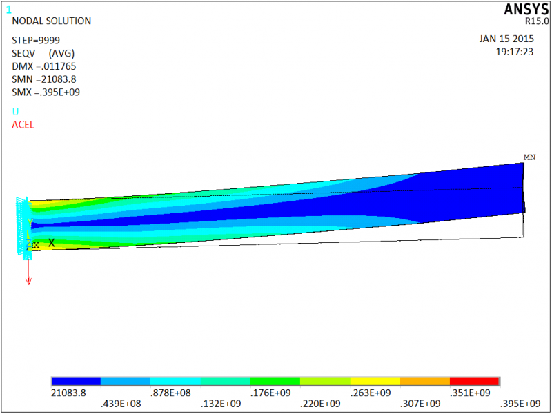 时域分析方案一:通过D,nodes,ACCY,%Xbl%,命令,将时域垂(Y)向加速度施加给左端悬臂处的节点,结果如图3;