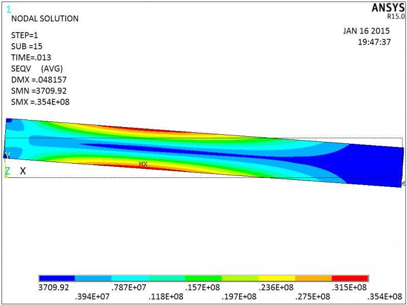 时域分析方案二: 在方案一的基础上,约束左端节点X向和Z向的位移,结果如图4。
