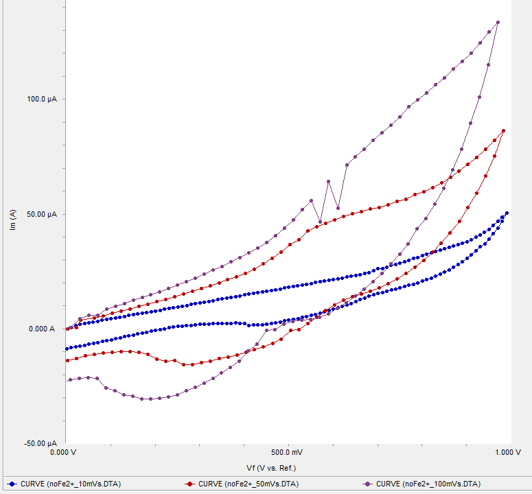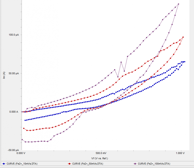 1. 加和没加Fe2+好像没区别啊,为什么呢?而且电流超过100uA,是电解水了吗? 区别不太大,因为你加的Fe2+毕竟量不多,你可以尝试不同浓度的区别; 电流100μA不是特别大; 电解水要1.23V,你的电压范围应该不会电解水; 2.为什么100mV/s的总会在600mV左右出现乱点呢? 这个很少遇到,除去那两个“跳点”曲线还是很连贯的,也许高扫速不稳定神马的。。 3.工作电极铂丝(d=1mm)多长合适呢?我用的都超过100mm了,老板不让剪断。 三电极系统一般要三电极在液面下等高,所以你的Pt有配合你的工作电极和参比电极,命该剪时终须剪。 加油~ |