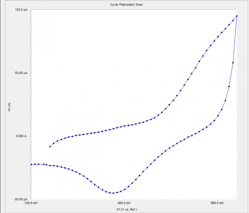 | 各位虫友,根据Fe2+→Fe3+,应该有个电流峰,根据Randles-Reveck方程应该能算出Fe2+浓度。为什么我测得CV曲线没任何峰呢? |