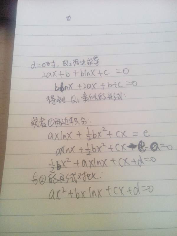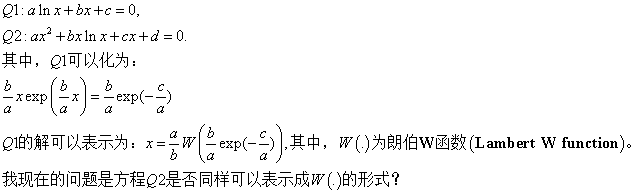 变换一下,可以的。 应用ProductLog()函数:对于方程z=w*e^w ,则 W= ProductLog(z) 原式 a*x^2+b*exp( ln(x) )*ln(x) + c*x + d =0 exp( ln(x) )*ln(x) = [-a*x^2 - c*x - d]/b ln(x) =ProductLog([-a*x^2 - c*x - d]/b) ProductLog 与lambert function 是双胞胎。 http://reference.wolfram.com/language/ref/ProductLog.html |