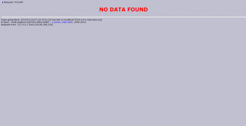 求助大神: 如何查询伽马射线与物质相互作用的反应截面曲线?? 在https://www-nds.iaea.org/exfor/endf.htm中查询总是显示No data found 输入和输出见附件图片,谢谢! 不知道哪里出错了! ENDF Evaluated Nuclear Data File.png E4 Servlet Select.png |