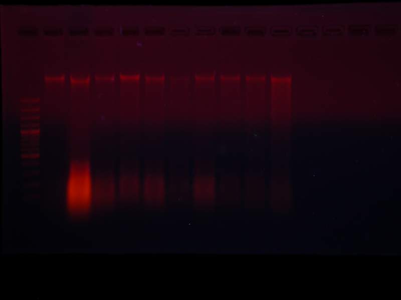 如图,动物组织器官dna提取。完全按照试剂盒提取,发现有杂带,是蛋白么?是否还需要酚氯仿抽提,谢谢。