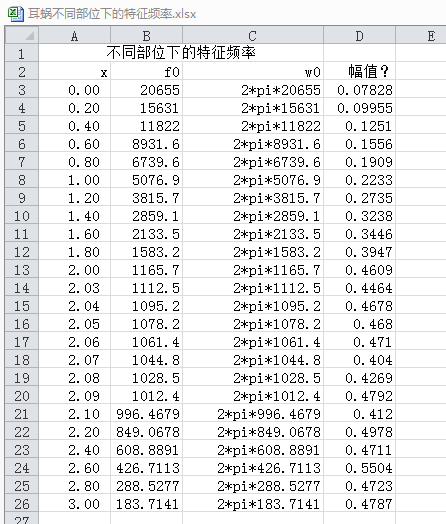 耳蜗基底膜不同部位有不同的特征频率,与未知的关系如下附件,我用MATLAB运行得到的调谐曲线与实际情况不符,假如正弦刺激的频率为1000Hz,那么,得到的图像应该在1000Hz处所对应的位置幅值最高,其他地方很小甚至为零。但是,从表格可以看出来,随着位移的增加,频率逐渐减小,幅值一直在增加,并没有出现先增加后减小的现象,有哪位大神能指点一下呢?