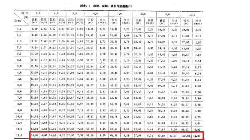 现在知道了水深、周期、波长与波速度表(1) 还有海况中波浪波高的关系,是否可以把海况与表(1)联系起来 比如红色框中,我选的几组数据,分别应该对应什么海况呢? 谢谢 水深、周期、波长与波速度表(1).jpg |