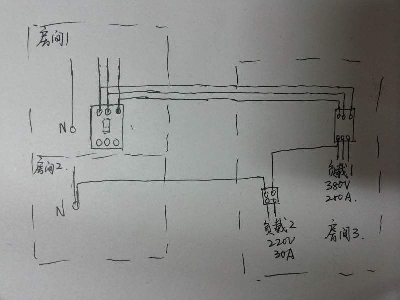 这样接线是可以的,但是注意两个问题,一是房间二的线路上不能有漏电开关,否则漏电开关会跳闸合不上,二是30A的电流有点大,确定房间二的线径够大能够承受房间三增加的电流。如果房间三的单相电不常用或功率不大可 ...