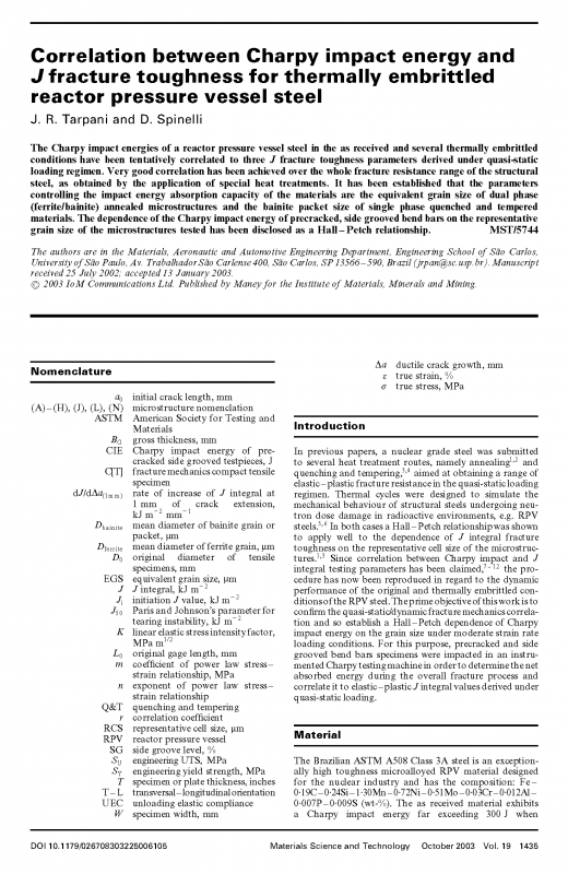 沒有問題,兩者有線性關係,如附件。 另外: www.eurofitnet.org/sintap_BRITISH_STEEL_BS-17.pdf Correlation between Charpy impact energy and J fracture toughness for thermally embrittled reactor pressure vessel steel_頁面_1.png Correlation between Charpy impact energy and J fracture toughness for thermally embrittled reactor pressure vessel steel_頁面_2.png Correlation between Charpy impact energy and J fracture toughness for thermally embrittled reactor pressure vessel steel_頁面_3.png Correlation between Charpy impact energy and J fracture toughness for thermally embrittled reactor pressure vessel steel_頁面_4.png Correlation between Charpy impact energy and J fracture toughness for thermally embrittled reactor pressure vessel steel_頁面_5.png Correlation between Charpy impact energy and J fracture toughness for thermally embrittled reactor pressure vessel steel_頁面_6.png Correlation between Charpy impact energy and J fracture toughness for thermally embrittled reactor pressure vessel steel_頁面_7.png |