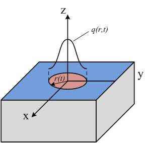 (2)面热源上的热流密度是在径向上成高斯分布的,即 q(r,t);