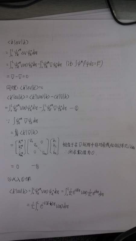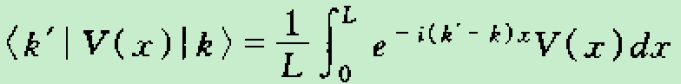*是共轭的意思。E是能量本征值是一个实数,所以左或右乘实际就是波函数相乘再积分,而v(x)不是这样就得用下面你贴出的那几个式子了。<|和|>是左矢和右矢<k|△v|k>就按你贴出的那个积分k和k'计算,你会发现就是对德尔塔v的空间平均,就是楼上说的求平均故为0.而<k'|v|k>按你贴出的那个积分式子计算并让k'-k=2nπ/a 你会发现它和复数形式傅里叶级数展开第n项系数是一个式。子。这些在量子力学教材里都可以找到,你可以大概翻一翻了解一下基本知识点就ok。 [ 发自小木虫客户端 ] |