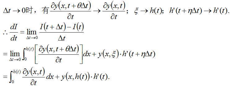 如题,公式如图所示,y为 x 和 t 的函数,h 为 t 的函数,积分对t 求导,结果为多少?