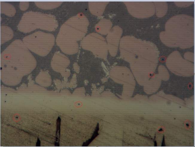 我做了铜基钎料钎焊黄铜的焊缝的金相,但是抛光后,表面有许多黑色的点,如图中红色标记所示,抛光布已经换了几次了,抛光液用的是金刚石抛光液,不知道是什么原因,有什么方法可以避免,求大神帮忙。