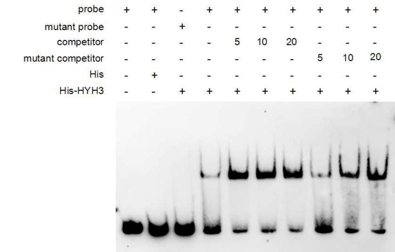竞争性探针是曝不出颜色的吧?如果是那样的话,下面那条带反而变浅了,说明竞争性探针可以帮助probe结合HYH3.