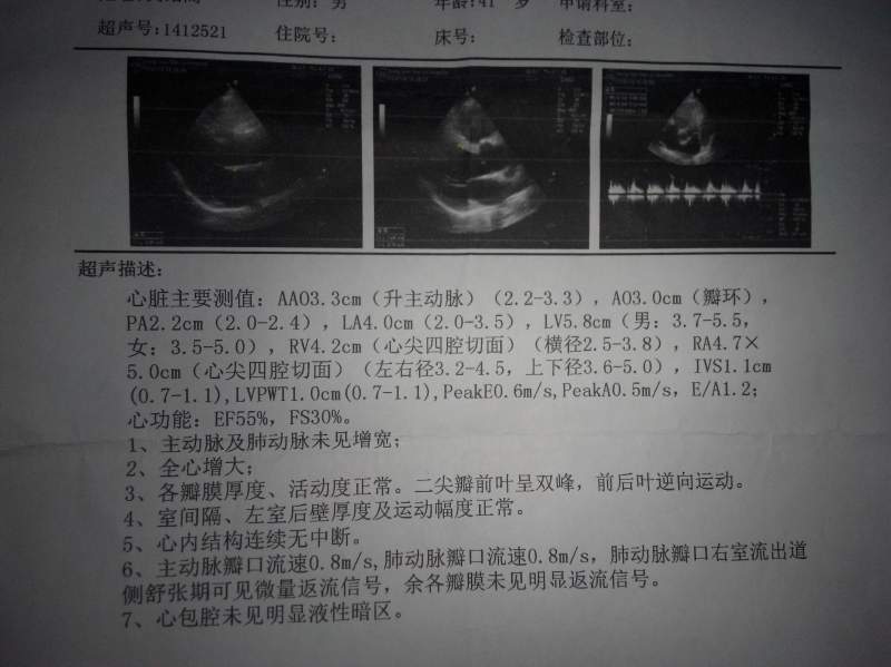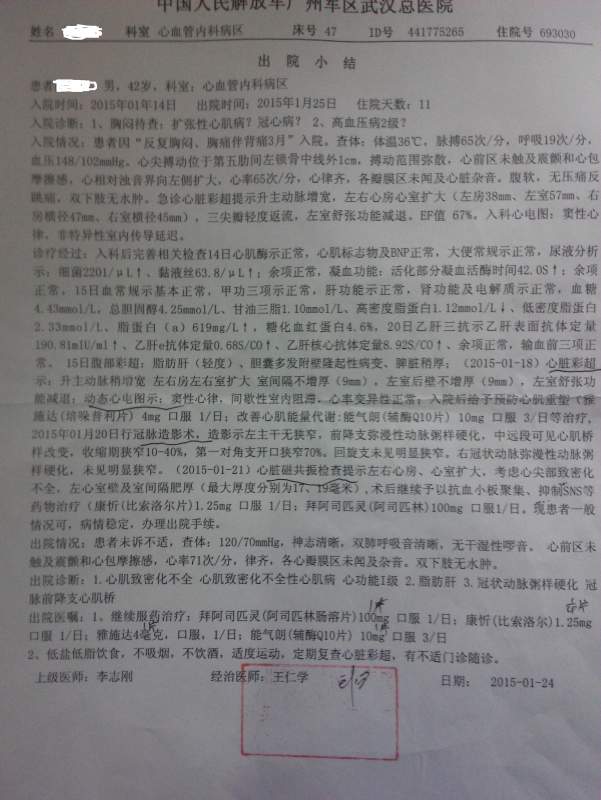 我一个亲戚,因反复胸闷,胸痛伴背痛三个月,入院做了一些检查,现已出院,诊断结果是心肌病,脂肪肝以及冠状动脉粥样硬化。我是学药的,医学方面的东西不是太懂,所以请各位懂医的朋友能帮忙看一下,情况严不严重,如果要治疗的话,哪些医院比较好。ps:诊断的结果放在附件里了,谢谢各位了~ 1.jpg 2.jpg 3.jpg 4.jpg |