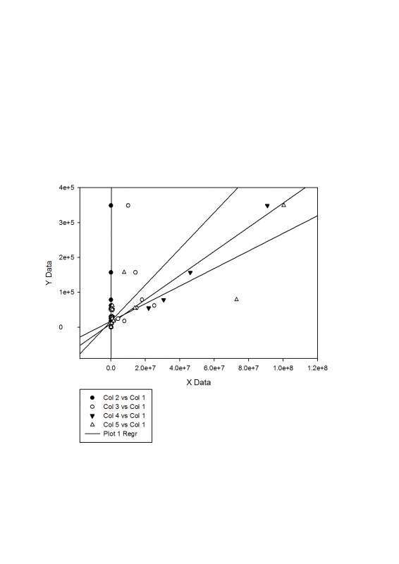 各位大侠,我在做简单的回归线性,用simgaplot做的,一个y,4个x值,结果其中一x的值较小然后它的回归线就是垂直的,怎么把它跟其他的弄成倾斜的呢,大侠们看看