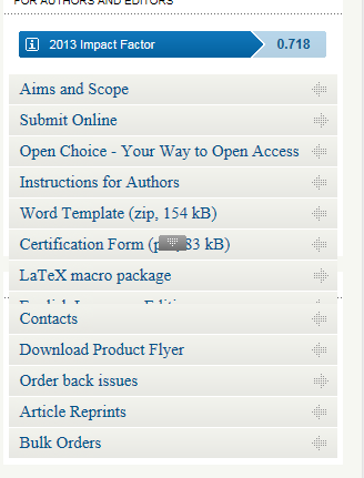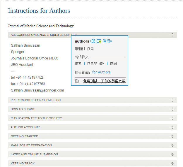 最近想投一篇文章到Journal of Marine Science and Technology——Japan上,但是在期刊主页上没有找到合适的投初稿要求和相应的模板。 图片1中点击“Instructions for Authors”系统没有反应,点击下载“Word Template”中的word文件是空的。(图片1来自http://www.springer.com/engineer ... age=editorialBoard#); 图片2中点击Instructions for Authors 下面的“PREREQUISITES FOR SUBMISSION”,"HOW TO SUBMIT","PUBLICATION FEE TO THE SOCIETY"等等都没有反应。(图片2 来自http://www.springer.com/engineer ... sPage=pltci_2003060)。 期间换过浏览器和电脑,结果是一样的。是我没有找到合适的地方么?还是有别的原因呢? 想请教一下各位投过这本杂志的朋友帮我指点一下,或者将投稿要求的相关文件发给我一下(chenhejlu@163.com),不胜感激,谢谢。 1.png 2.png |
