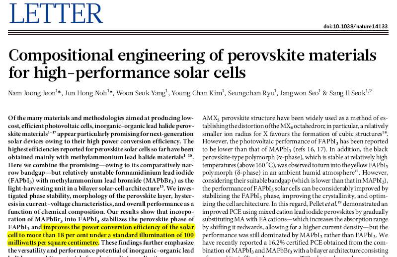最新一期science,钙钛矿敏化太阳能电池效率突破19%,分享!