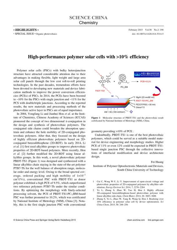 中国科学 化学(Science China Chemistry)第58卷第2期出版了由该刊编委李永舫院士和副主编曹镛院士组织的” Organic photovoltaics”(有机光伏)专辑。这个专辑集中报道了我国在有机光伏研究领域的最新研究成果及对国内外这一研究领域最新进展的综述及点评,对有机光伏领域的研究者具有重要参考价值。在这期专辑中,共发表24篇文章,包括4篇Highlights,3篇Reviews,1篇Feature Article,15篇Research articles和1篇Communication。内容涵盖聚合物给体光伏材料、聚合物太阳能电池器件、有机小分子给体光伏材料、有机小分子受体光伏材料以及富勒烯受体光伏材料等。 Highlights文章中,李永舫院士、吴宏滨教授、黄飞教授等分别对有机光伏太阳能电池领域国内最近突破性进展进行了亮点介绍。 Reviews文章中,李永舫院士等系统地评述了共轭聚合物给体材料侧链工程的研究进展,总结了侧链对光伏性能的影响规律,并被选为封面文章。浙江大学陈红征教授等综述了溶液可加工的等离子激元效应应用于有机光伏的最新进展。 近几年来,有机-无机杂化钙钛矿太阳能电池光电转换效率的最高纪录不断被刷新,引起了国际上的高度关注。本专辑中中科院物理所孟庆波研究员等结合自己课题组的研究工作,简要介绍了国内钙钛矿太阳能电池的研究情况,重点阐述了高质量钙钛矿薄膜的沉积方法、器件结构的优化以及界面工程等方面的进展,并进一步讨论了成本、稳定性及环境因素对其实现商业应用及产业化的影响。 对太阳能电池内部机制的理解有利于人们找到控制给受体界面和电极活性层界面动态光伏过程的关键因素,从而进一步提高太阳能量转换效率。Feature article文章中,胡斌教授等利用两个独特的磁光实验手段,即光诱导电容和磁场效应测量,研究了有机太阳能电池工作条件下给体:受体界面及电极界面处的动态光伏过程。 Research articles中,中国科学院化学所侯剑辉研究员等通过在活性层中加入添加剂并调节添加剂的比例,优化了PBDT-TS1/PC71BM异质结材料器件,实现了单层异质结有机光伏电池能量转换效率超过10%,并被选为热点文章(hot paper)。该刊青年编委,华南理工大学黄飞教授对该研究进行了亮点介绍(highlights)。 [url= http://chem.scichina.com:8081/sciBe/EN/volumn/home.shtml] http://chem.scichina.com:8081/sciBe/EN/volumn/home.shtml[/url] image-0001.jpg |