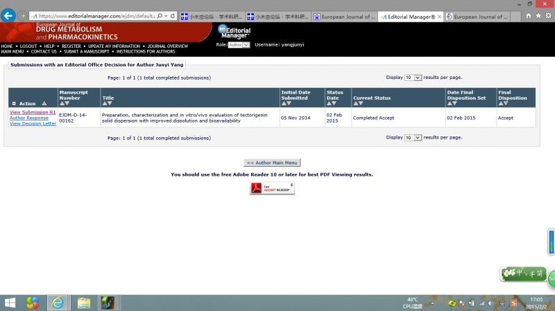 各位虫友,我于2014年11月5日在European Journal of Drug Metabolism and Pharmacokinetics 杂志上投了一篇文章,返修了一次,今天状态变为了Accept,请问是否意味着我的文章被接受了?(目前状态见上传的图片),接下来我该做什么?在它的主页上没有提到收费这个话题,请投过该杂志的前辈指点,这家杂志是否收费或收费情况如何?本人在此跪谢了!!!(第一次投英文,没任何经验!)