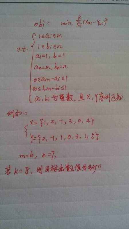 例如:X={1, 2,-1, 3, 0, 4},Y={2,-1,1,0,3,1,5}, m=6和n=7分别X和Y的序列长度,若K=8已知,求目标函数值。