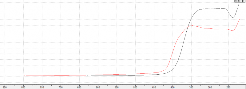 各位大神,我做了二氧化钛负载,和空白二氧化钛做了个固体紫外,图片如下,红线和黑色的线哪个在可见光下效果好啊,