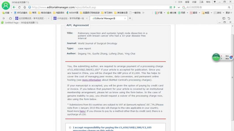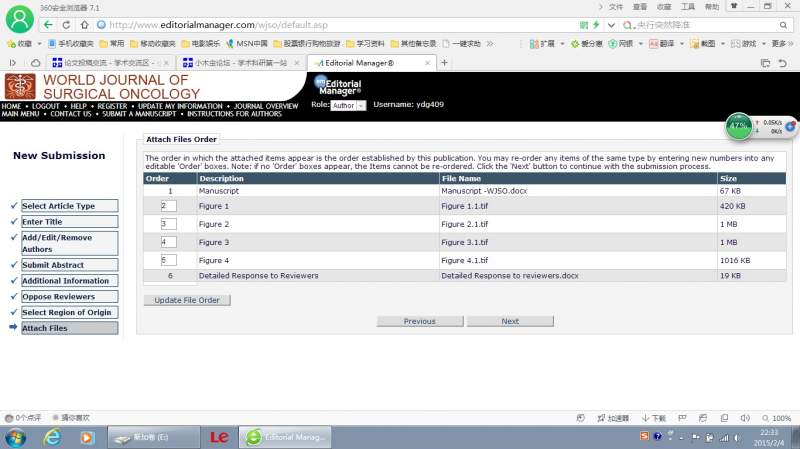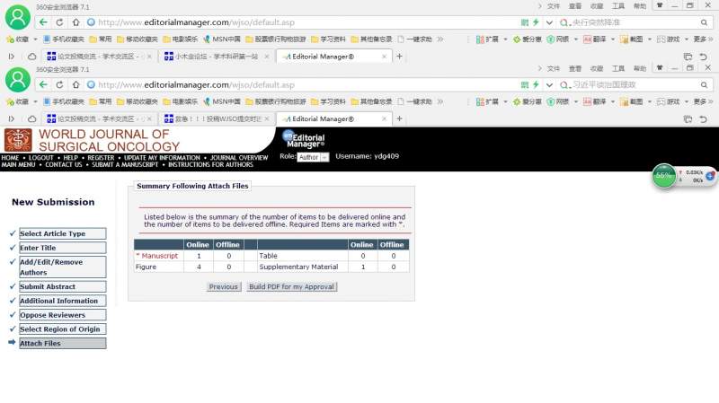 昨日投稿WJSO杂志,这个杂志最近投稿渠道更换了,详见网址:http://www.editorialmanager.com/wjso/default.asp. 前面的操作步骤跟其他杂志差不多,进行顺利。文章、图表等都上传成功,见图1. 待续。 图1.jpg |