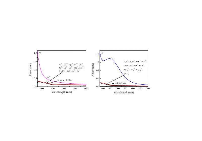 做聚合物对离子检测时,为何在加入阴离子后再加入Fe3+的紫外光谱图和左边那个图有那么大差异?
